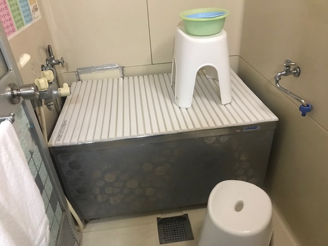 新しい浴室です。左側の風呂ふたは、魔法ビン浴槽専用のふたです。