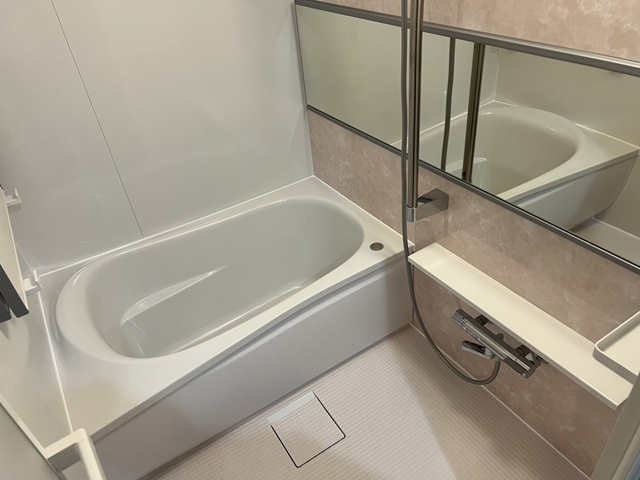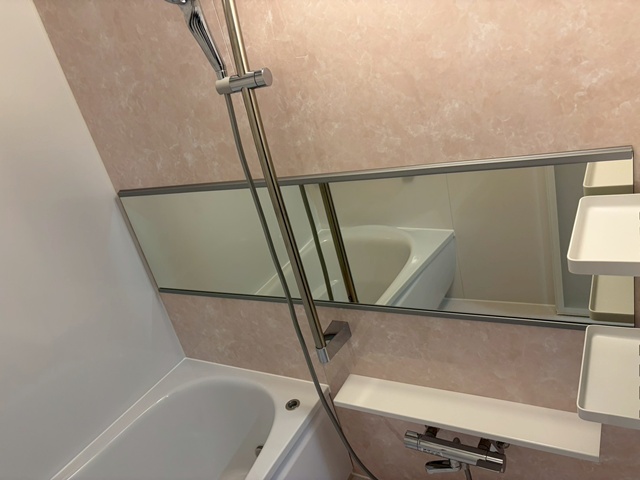 | 壁は1面をアクセントパネルにする事と鏡をワイドミラーにする事で浴室が広く感じますね。 | コンフォートシャワーバーはシャワーの高さ角度を自由に動かすことが出来て 手すりの代わりにもなり、とっても便利です。 |