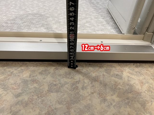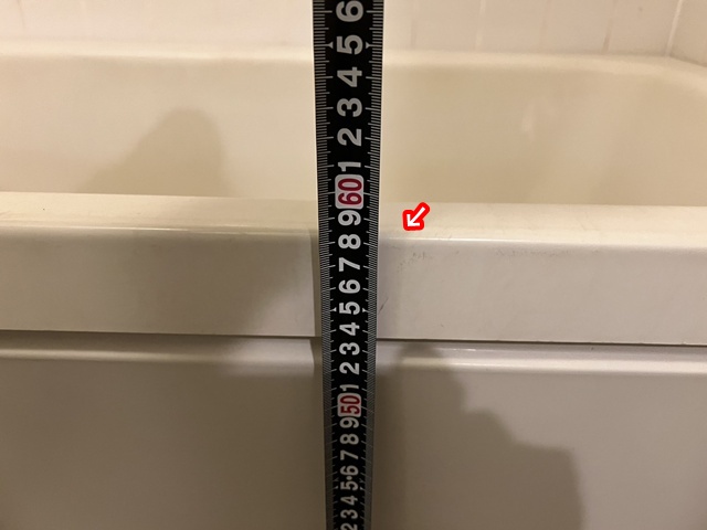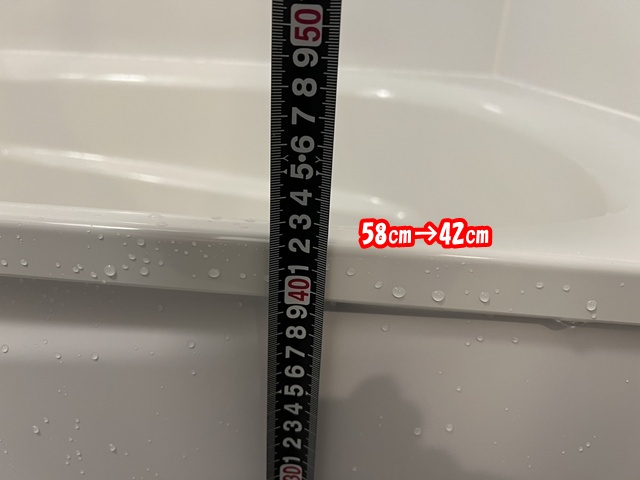 | 浴室入り口の段差は12㎝→6㎝まで低くなりました。 | 浴槽の高さも58㎝→42㎝になりました。 |