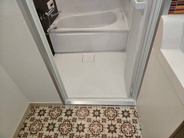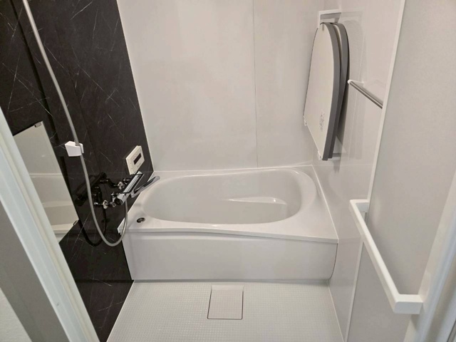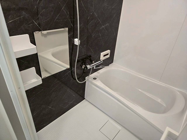 | 照明は、とっても明るくなり、お風呂の時間が楽しくなりそうですね。 | 今回のリフォームで床がホワイトになりアクセントパネルの位置を変える事で浴室が広く感じますね。 |