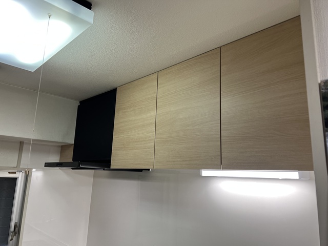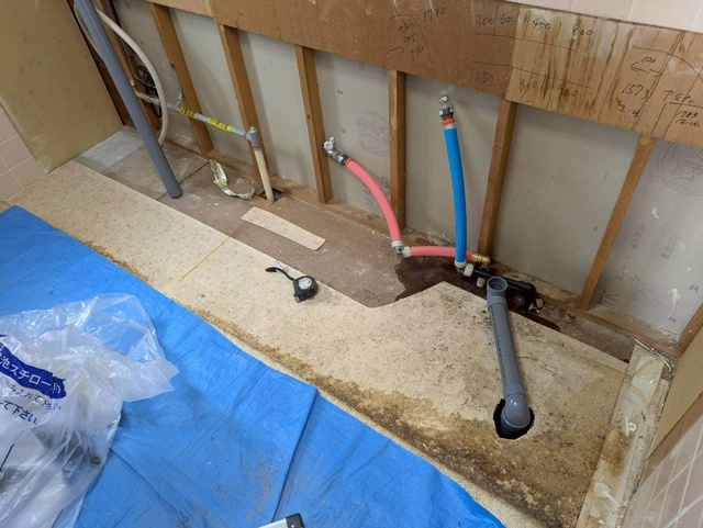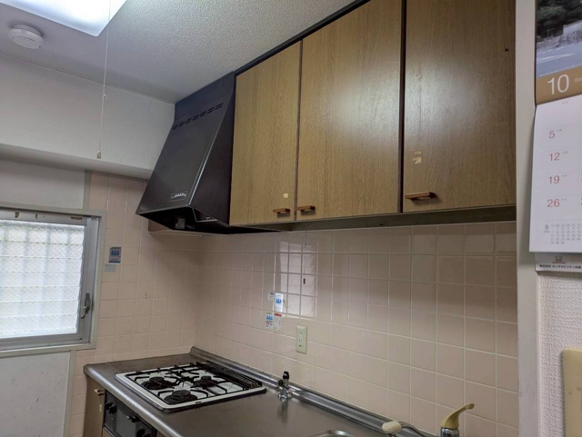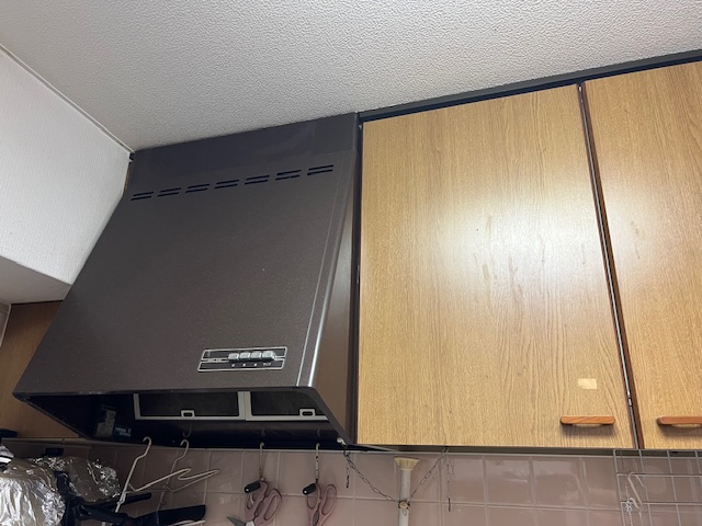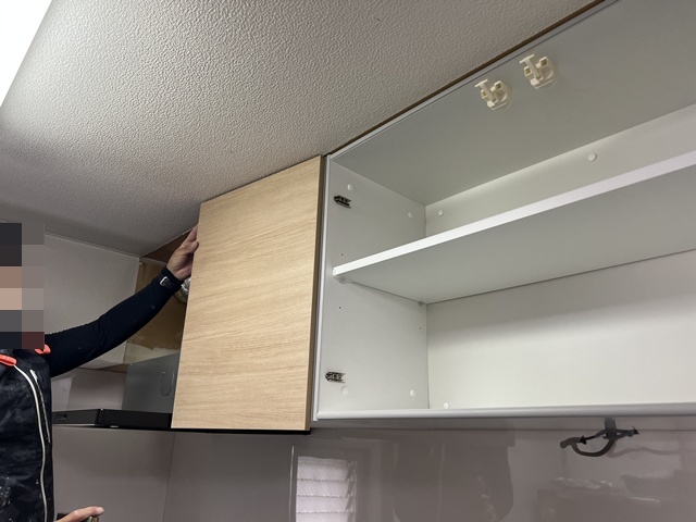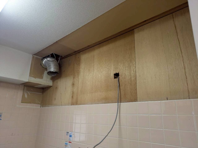 | 吊り戸部分を解体致しました。 | 下台を解体して給排水管を交換いたしました。 | レンジフード・吊り戸部分を設置しています。 |
