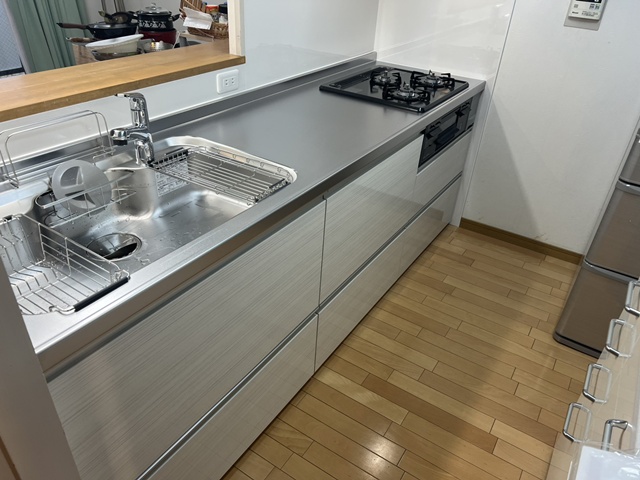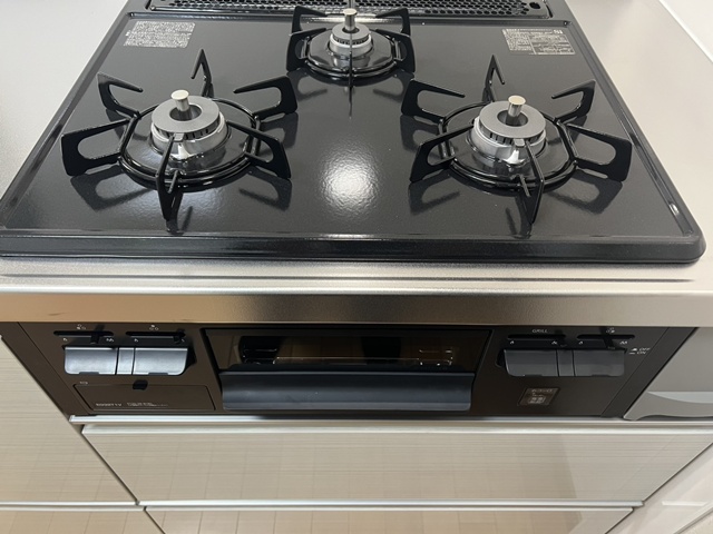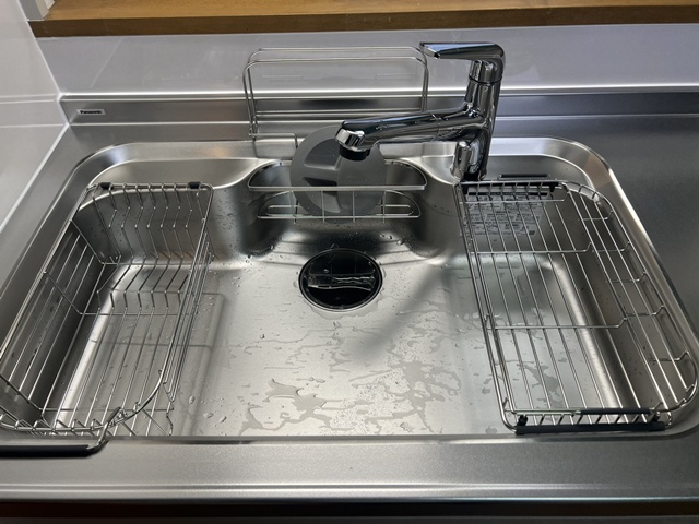 | ガスコンロはホーロートップ・片面焼きグリルでお手入れが楽々ですね(^^)/ | シンクは静音シンクで洗剤バスケット・水切りバスケットも付いていて、とっても便利です。 |