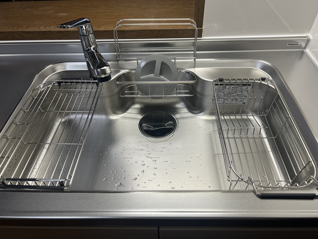 シンクは静音シンクで洗剤バスケット・水切りバスケット も付いているので調理スペースが広く使えますね。 |