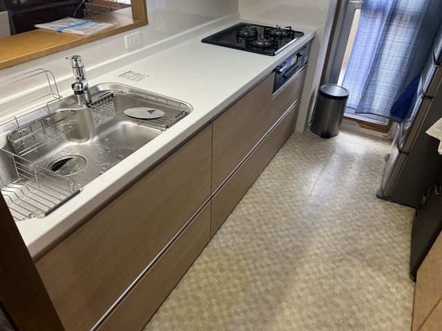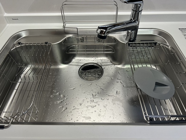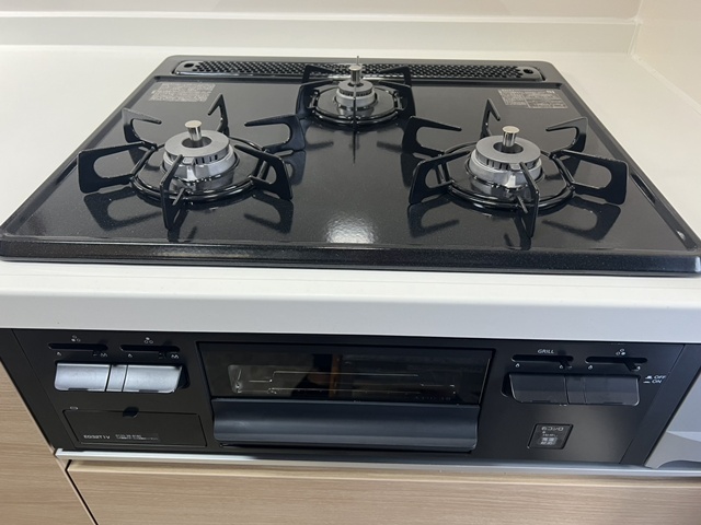 | シンクは静音シンクで洗剤バスケット・水切りバスケットも付いていて、調理スペースが広く使えますね。 | ガスコンロはホーロートップ・片面焼きグリルでお手入れが楽々です!! |