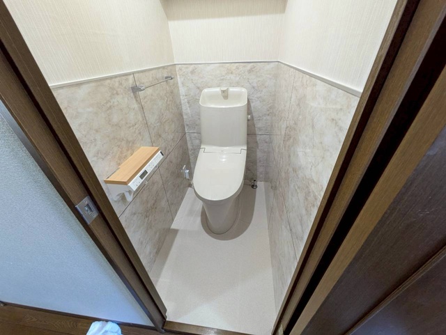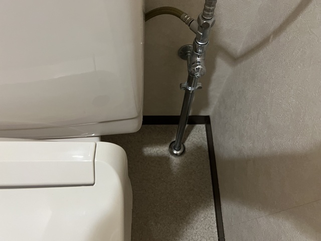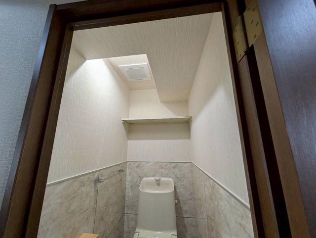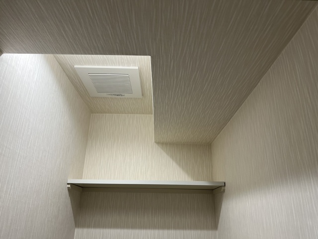 | 工事後は給水管が無くなり床のお掃除がしやすくなりましたね(^^)/ | かべ・天井部分のクロスを張替え換気扇・LEDダウンライトも交換いたしました。 |