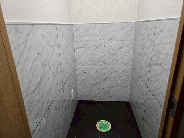 | トイレを取外しました。 | まずは床のクッションフロアーを張替えました。 | 壁の一部をパネル仕上に致しました。 |