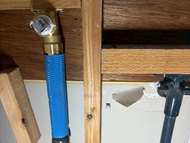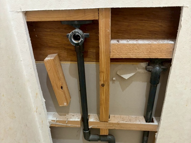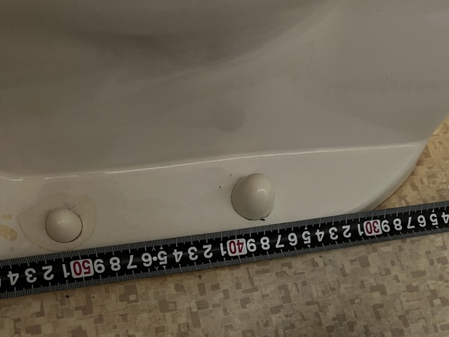 | 工事前のトイレです。 | 床排水(下抜き)です。 | 後付けの手すりが有りました。 |