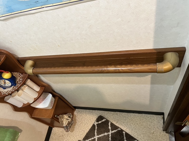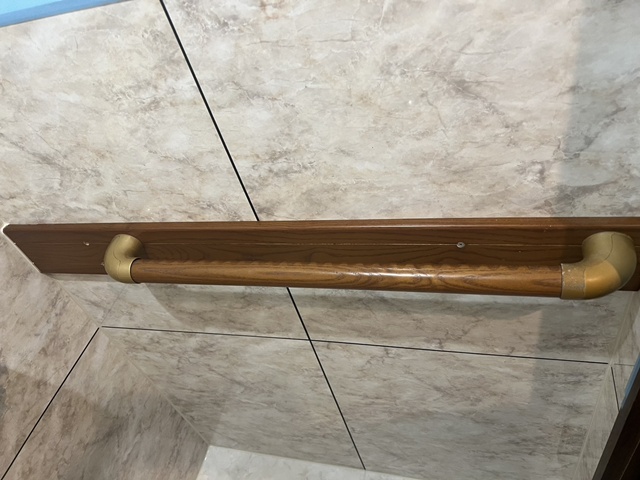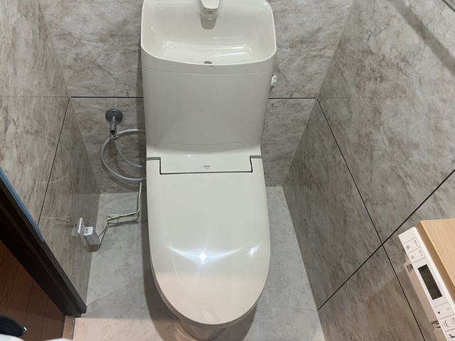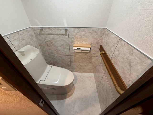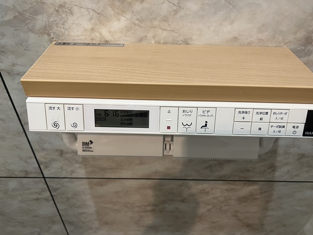 | 後付け用の手すりは、リフォーム後も再利用して取付いたしました。 | インテリアリモコンは2連式のペーパーホルダーと一体になっていて色々な機能も付いていてとっても便利です。 |