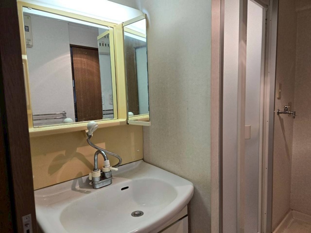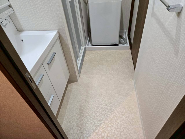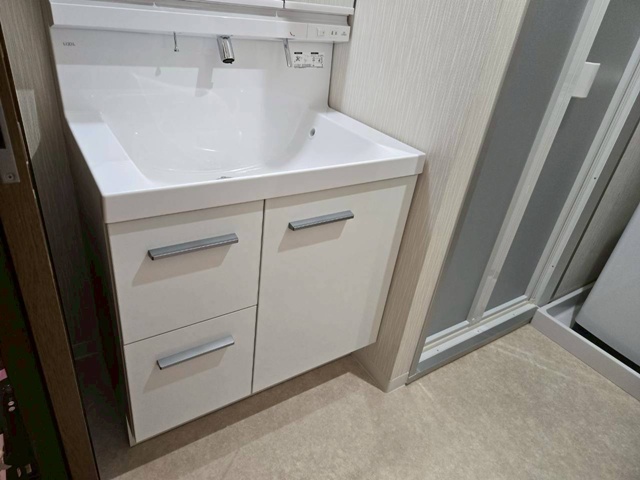| 天井・カベのクロスと床のクッションフロアーを張替えたので洗面所がとっても明るくなりましたね(^^)/ | 下台の収納は左側が引出タイプ右側が開き扉タイプになっているので用途に合わせて収納出来ますね。 |