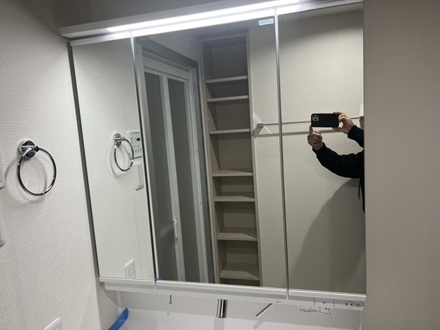 | 鏡の裏も収納3面鏡になっているのでタップリ収納出来るようになりました。 |