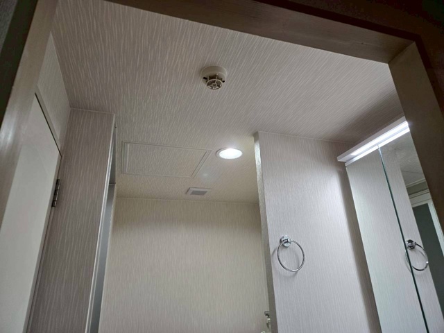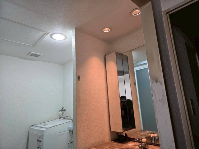 | 天井部分はカベ・天井のクロスを張替えLEDダウンライトも交換したので洗面所がとっても明るくなりましたね(^^)/ | 下台は左側が引出タイプで右側が開き扉タイプになっていて用途に合わせて収納できますね。 |