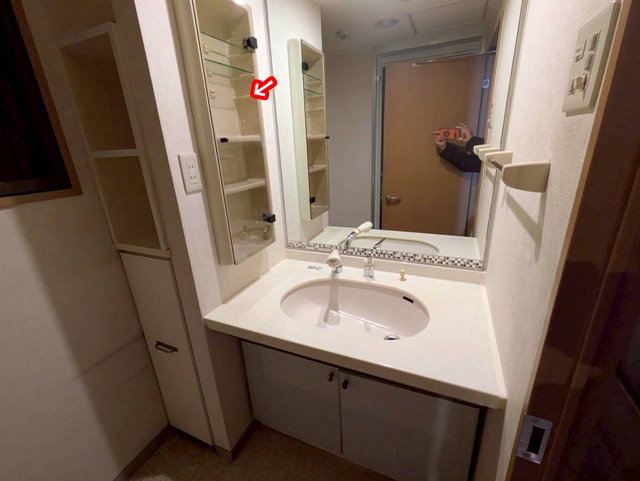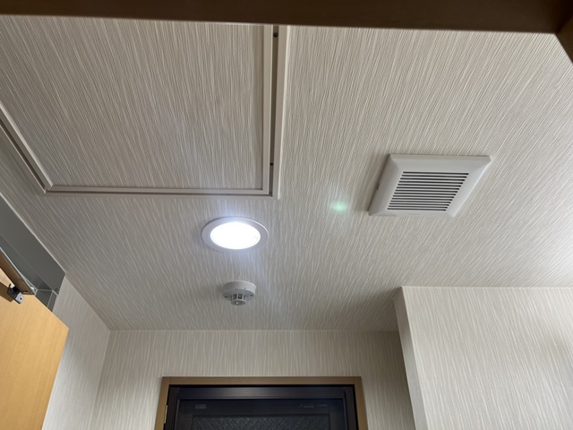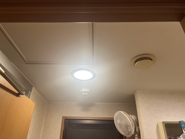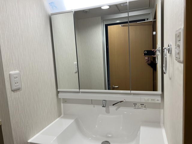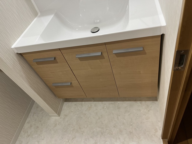| 天井部分はクロスを張替えLEDダウンライト・換気カバーを交換して、とっても明るくなりましたね。 | 下台は左側が引出タイプで右側が開き扉タイプになっていて用途に合わせてタップリ収納できますね。 |