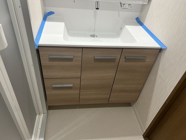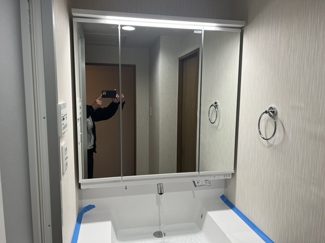 上台は収納3面鏡でタップリ収納できるようになったので 左の壁に有った収納棚は撤去致しました。。 |