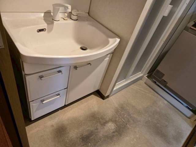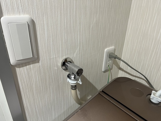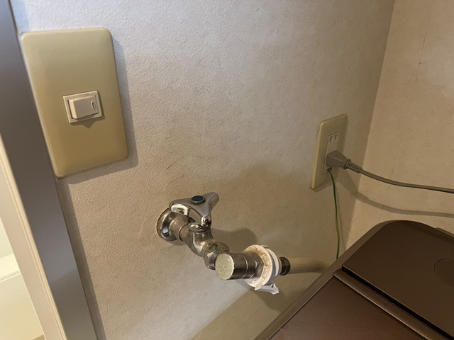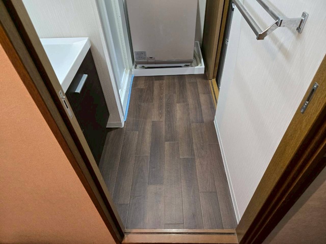 | 洗濯給水栓はワンタッチタイプにコンセントカバー・スイッチカバーも新しい物に交換致しました。 | 床のクッションフロアーはサンゲツHM12083(フローリング調)に交換致しました。 |