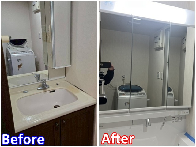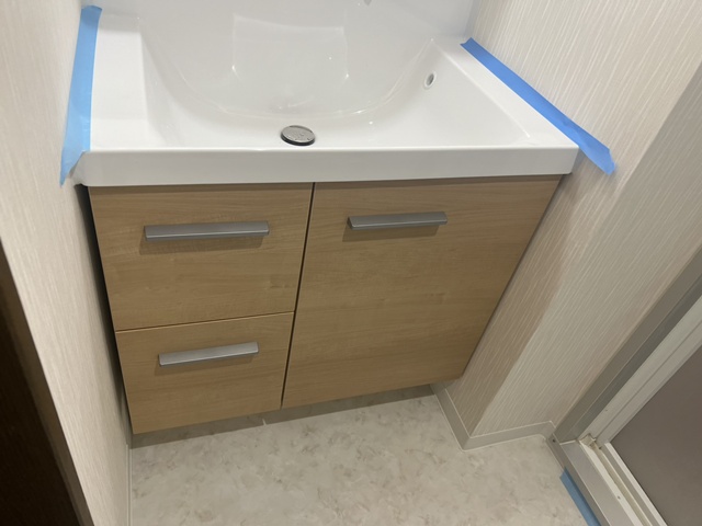 | 壁は、クロスを張替えてスィッチボタンもビックボタンのカバーに変えたのでボタンが押しやすくなりました。 | 下台は左側が引出タイプで右側が開き扉タイプになったので用途に合わせて収納できますね。 |