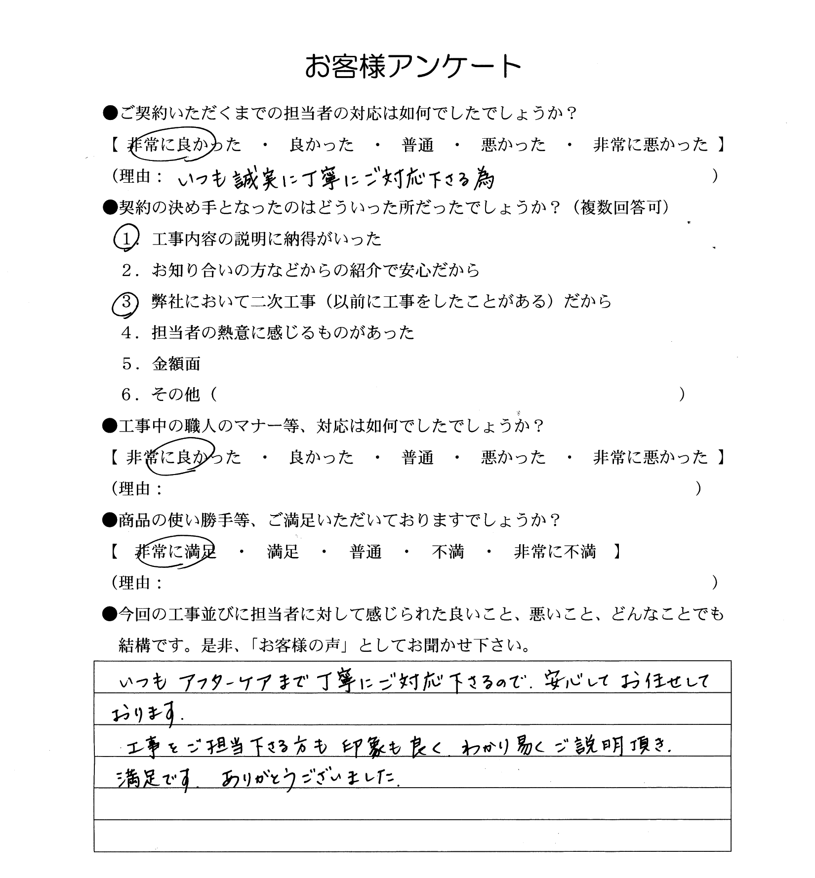 工事をご担当下さる方も印象も良く、わかり易くご説明頂き満足です。ありがとうございました。