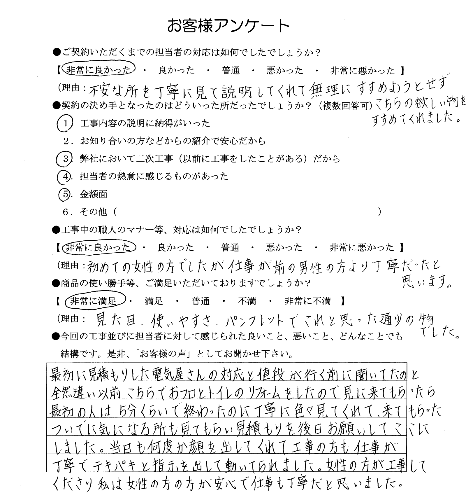 | (理由:初めての女性の方でしたが仕事が前の男性の方より丁寧だったと思います。) |