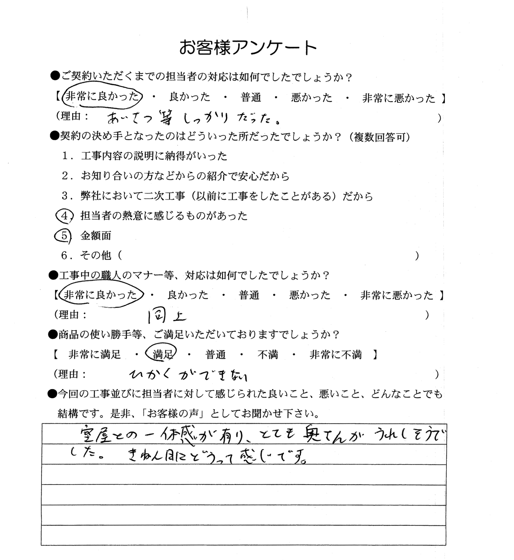 M様、この度は工事のご依頼ありがとうございました。奥様にもご満足いただけてよかったです。また何かございましたらお気軽にお問い合わせください。