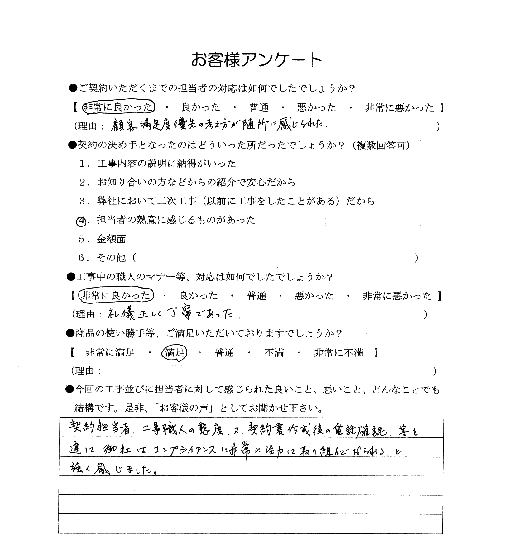 契約担当者、工事職人の態度、又、契約書作成後の電話確認等を通して御社はコンプライアンスに非常に注力して取り組んでおられると強く感じました。