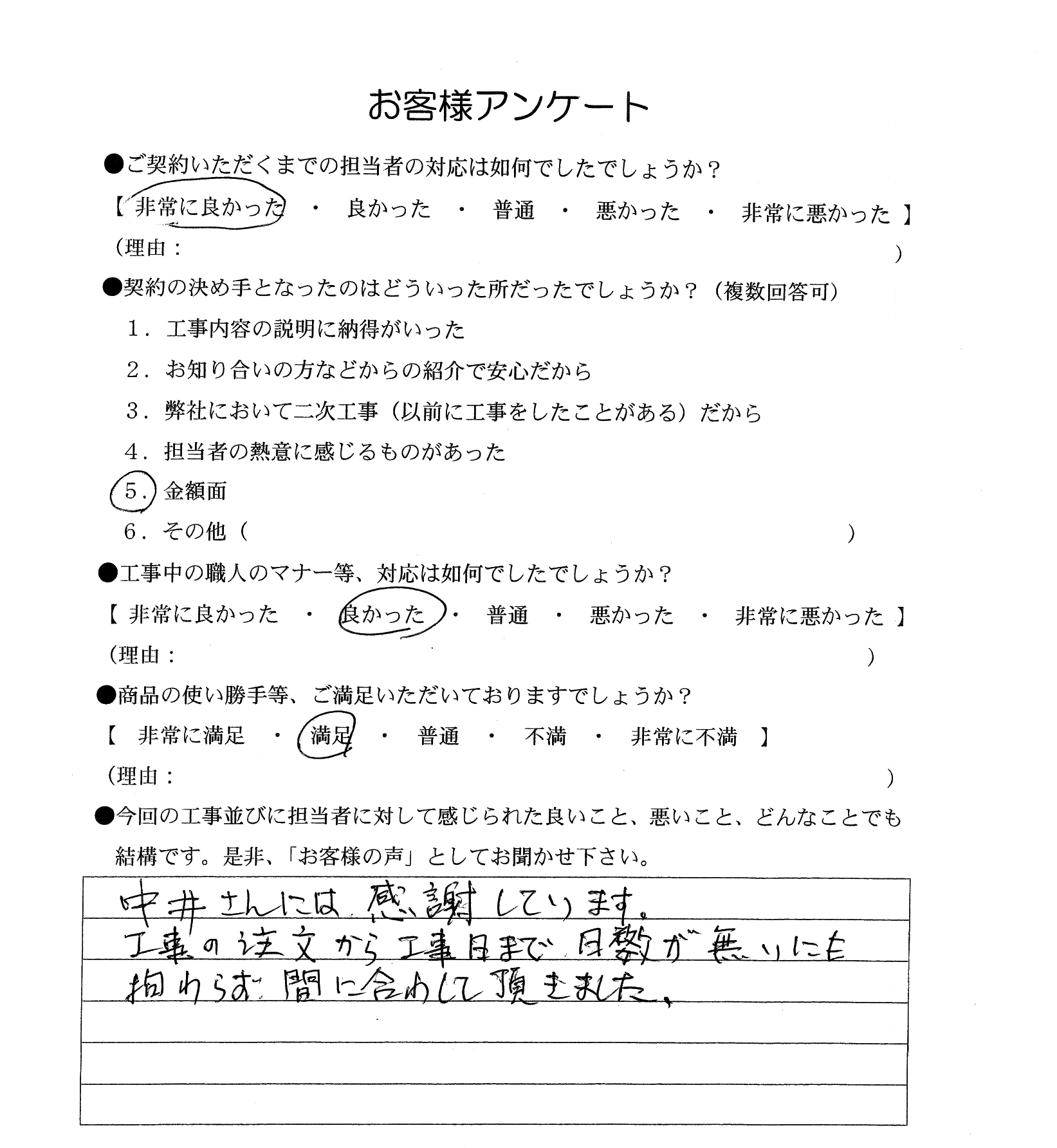 工事の注文から工事日まで日数が無いにも拘わらず間に合わせて頂きました。